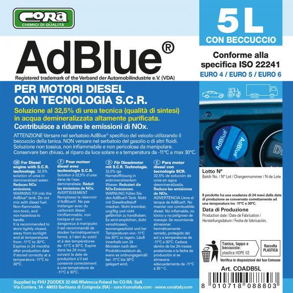 Soluzione al 32,5% di urea tecnica (qualità di sintesi) in acqua demineralizzata altamente purificata. Specifica per tutti i motori diesel EURO 4/5/6 con tecnologia S.C.R. Contribuisce a ridurre le emissioni di NOx. Conforme alla specifica ISO 22241. Confezione: tanica da 5 litri con pratico beccuccio travasatore flessibile (incastonato nel vano sagomato sul retro).