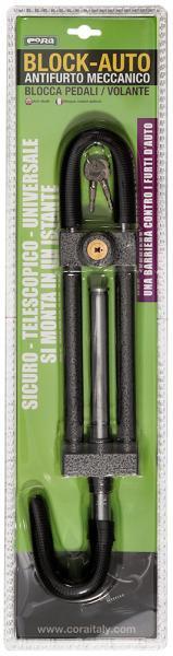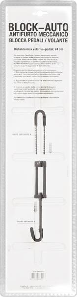 Antifurto bloccapedali/volante universale. Di facile applicazione, chiude completamente la corona del volante in modo da non poter essere sganciato. Provvisto di chiave speciale cilindrica. Distanza max volante-pedali: 74 cm.