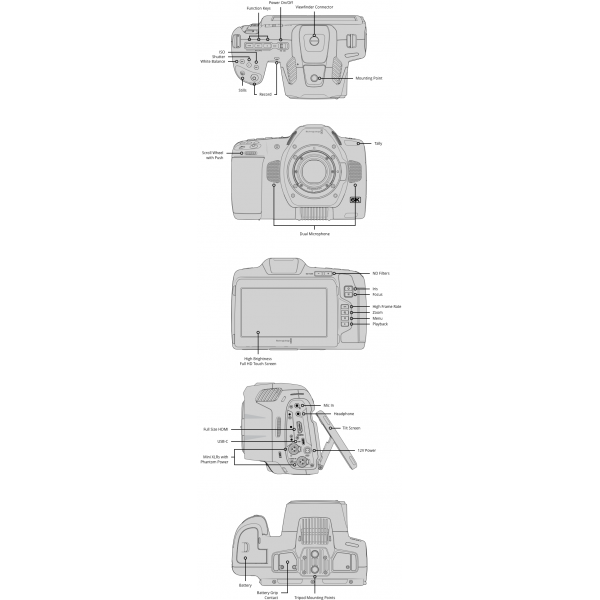 Blackmagic Pocket Cinema Camera La nuova generazione di cineprese digitali palmari Arricchisci le tue produzioni con il cinema digitale! Pocket Cinema Camera è molto più di una semplice videocamera. Grazie alle sue funzioni professionali produce immagini con la stessa estetica del cinema hollywoodiano. L’alta gamma dinamica, le prestazioni eccellenti in condizioni di scarsa illuminazione e Blackmagic RAW garantiscono immagini cinematografiche con tonalità della pelle accurate e colori favolosi. Disponibile nel modello 4K, 6K e 6K Pro, ospita un ampio display LCD da 5” per una messa a fuoco impeccabile, slot per schede SD e CFast, porta USB-C per registrare su drive esterni, e attacchi obiettivo EF o micro 4/3. Inoltre ha in dotazione DaVinci Resolve Studio per svolgere montaggio, correzione colore, post produzione audio e VFX! Produci il look di Hollywood in digitale Le Pocket Cinema Camera includono tutte le funzioni per creare lungometraggi, programmi TV e documentari, e allo stesso tempo rivoluzionare videoblog e contenuti per YouTube. Completa delle stesse funzioni delle camere digitali più costose, cattura colori intensi, dettagli minuziosi e una maggiore gamma dinamica tra le zone di luce più luminose e le ombre più scure. Questo è il segreto delle immagini mozzafiato dei film, ora a tua disposizione per accrescere il valore di qualsiasi progetto. Immagina di ottenere la stessa qualità cinematografica per film indipendenti, video musicali, matrimoniali e aziendali, documentari e non solo! Design ultra leggero in fibra di carbonio e policarbonato Pocket Cinema Camera racchiude numerose funzioni ad alta prestazione per il cinema digitale in un design elegante e maneggevole. Realizzata in un composto di fibra di carbonio e policarbonato leggero, dispone di un’impugnatura multifunzione con i controlli per Rec, ISO, bilanciamento del bianco e angolo dell’otturatore a portata di mano. In quanto autentica camera digitale avanzata, il sensore è progettato per ridurre il rumore termico, garantendo ombre più nitide e un ISO più alto. Inoltre l’ampio display LCD da 5” facilita la messa a fuoco con le risoluzioni 4K e 6K. Ospita anche un alloggiamento per la batteria rimovibile, quattro microfoni anti-shock, un attacco obiettivo resistente e un altoparlante integrato. Impugnatura multifunzione e controlli a portata di mano La impugnatura multifunzione dal design ergonomico mette a portata di mano le funzioni più importanti come ISO, bilanciamento del bianco e otturatore. Per esempio per regolare velocemente il diaframma basta spostare la rotella con il dito indice. I controlli aggiuntivi sono subito accessibili, a differenza delle DSLR, che li nascondono in complessi menù su uno schermo piccolo. Pocket Cinema Camera offre i pulsanti per registrazione e scatto, i pulsanti funzione personalizzabili, per alto frame rate, focus zoom, falsi colori e altro nella posizione di utilizzo più comoda e intuitiva. Pocket Cinema Camera 6K Pro include anche i controlli per i filtri ND. Sensore digitale cinematografico ad alta risoluzione Pocket Cinema Camera 4K vanta un sensore con risoluzione nativa di 4096 x 2160, mentre i modelli 6K offrono una risoluzione nativa di 6144 x 3456. Sotto la luce diretta del sole così come in condizioni di scarsa illuminazione, i 13 stop di gamma dinamica e il doppio ISO nativo fino a 25600 generano magnifiche immagini a basso rumore in qualsiasi condizione di luce. Inoltre il più ampio sensore Super 35 dei modelli 6K consente di filmare con una profondità di campo ridotta e obiettivi anamorfici. Tutti i modelli riprendono fino a 60 fps a piena risoluzione e fino a 120 fps in modalità finestra. Con la scienza del colore Blackmagic sfrutti la stessa tecnologia dell’immagine delle cineprese digitali più costose. Obiettivi cinematografici e fotografici Disponibile in tre modelli con attacco obiettivo EF o micro 4/3, Pocket Cinema Camera è compatibile con una vasta gamma di obiettivi ampiamente utilizzati in tutto il mondo. L’attacco EF sui modelli 6K consente di installare gli obiettivi che già usi con altre camere, per esempio DSLR, URSA Mini Pro o Blackmagic Cinema Camera. Gli obiettivi fotografici sono facilmente reperibili, consentono una vasta scelta creativa e generano immagini di qualità cinematografica. Con l’attacco attivo puoi regolare focus e diaframma con i pulsanti sulla camera o il touchscreen. Per ancora più flessibilità, l’attacco micro 4/3 del modello 4K si adatta alle ottiche PL, C, EF e non solo. Filtri ND integrati Pocket Cinema Camera 6K Pro include filtri ND infrarossi motorizzati di alta qualità per ridurre velocemente la quantità di luce che attraversa l’obiettivo. I filtri a 2, 4 e 6 stop sono progettati per assecondare la colorimetria e lo spazio colore della camera, offrendo una latitudine maggiore anche in condizioni di illuminazione estreme. I filtri IR agiscono sulla lunghezza d’onda ottica e infrarossa, eliminando in modo uniforme le anomalie di cui risentono le immagini. I pulsanti relativi si trovano sul retro della camera, e sono facilmente selezionabili con il pollice dall’impugnatura multifunzione. Il display LCD visualizza l’impostazione dei filtri come numero ND, stop di riduzione o frazione in base alla selezione dell’utente. Immagini mozzafiato in ampia gamma dinamica (HDR) La distanza tra le parti più luminose e scure dell’immagine si chiama gamma dinamica ed è misurata in stop. Le Pocket Cinema Camera dispongono di ben 13 stop di gamma dinamica, mantenendo una maggiore quantità di dettagli nelle aree più luminose e più scure dell’immagine rispetto alle normali videocamere. Per esempio quando imposti l’esposizione per una scena d’interni, potrai contare su una definizione impeccabile anche della luce filtrata dalla finestra, e ottenere colori più accurati dello spazio colore DCI-P3 usato per i film. Non solo, la camera ha in dotazione DaVinci Resolve Studio, che offre u