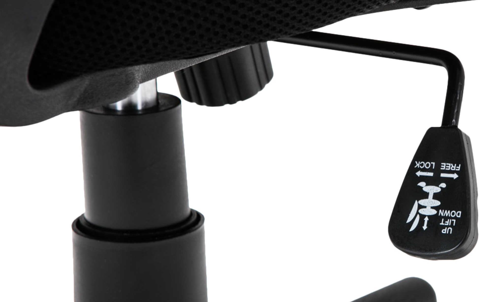 Das Gestell ist sehr stabil. Dank der verstellbaren Sitzhöhe ist ergonomisches Sitzen garantiert. Die Sitzhöhe ist mit dem Hebel unter dem Sitz stufenlos verstellbar. Außerdem verfügt der Drehstuhl über eine Wippmechanik. Über den Drehknopf unter der Sitzfläche kann der Widerstand bzw. die Spannung der Kippfunktion eingestellt werden.