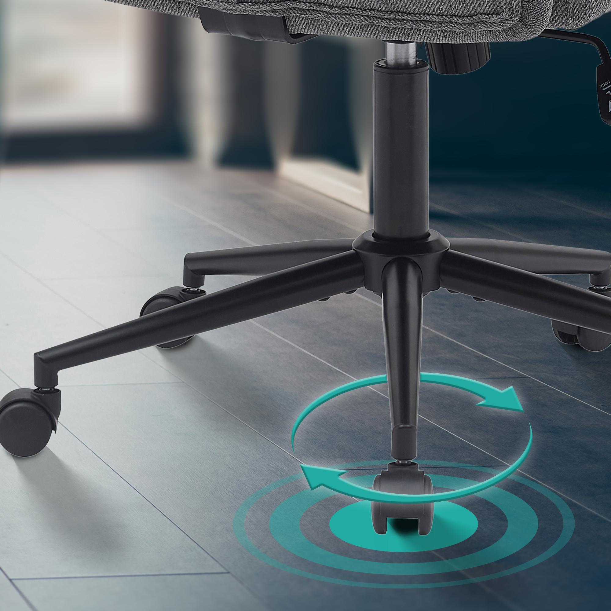 Der Schreibtischstuhl ist höhenverstellbar und um 360 Grad drehbar, sodass Sie ihn individuell an Ihre Bedürfnisse anpassen können. Dank der fünf Leichtlaufrollen lässt sich der Stuhl mühelos bewegen, ohne den Boden zu beschädigen. Die Spannung der integrierten Wippmechanik lässt sich anpassen.