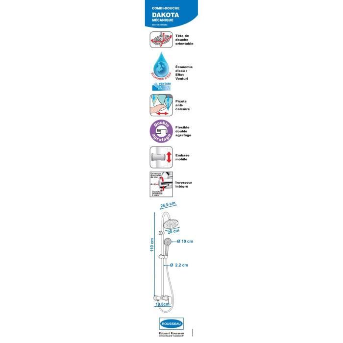 Soffione Ø 200 millimetri interamente cromato ABS – Risparmio d’acqua effetto Venturi – Braccio doccia Ø 22 mm in acciaio cromo – montaggio a parete: base mobile ABS – Supporto doccia e tilt scorrevole – 1 doccia a getto mano (pioggia) Ø 100 flessibile 1,50 m acciaio cromato – – miscelatore cartuccia di ceramica Ø 40 mm mm cromo ABS placcato.