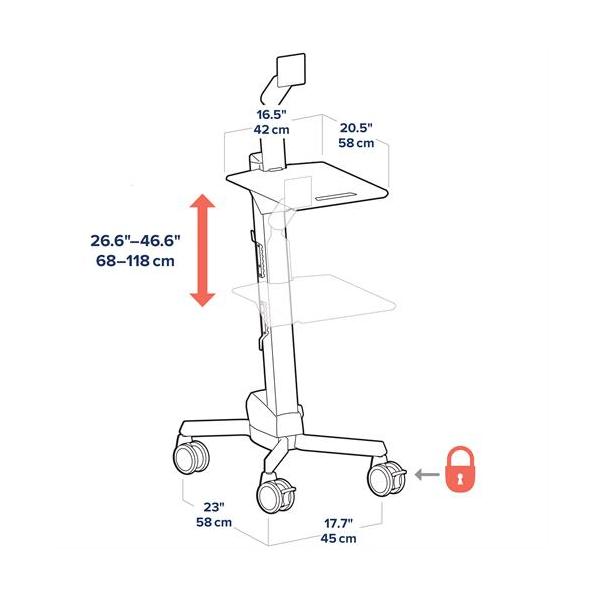 Carrello economico e regolabile in altezza per le esigenze IT mobili di oggi e di domani. Dotato di braccio LCD completamente regolabile, regolazione dell’altezza di 68 cm per lavorare da seduti o in piedi, supporto per CPU thin client conforme VESA, ampia superficie di lavoro, ingombro ridotto e robusta architettura aperta.
