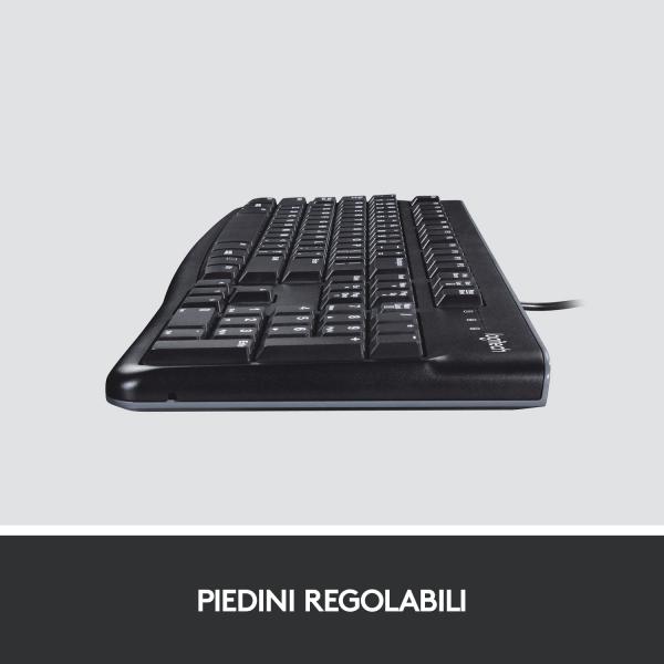 Logitech® Desktop K120.Una tastiera durevole che assicura comfort, stile e semplicità. Le comodità è assicurata grazie ai tasti silenziosi dal profilo ribassato e al layout tradizionale con tasti funzione e tastierino numerico di dimensioni standard. Grazie al profilo sottile e a prova di schizzi*, ai tasti robusti che possono resistere fino a 10 milioni di battute e ai piedini inclinabili regolabili e robusti, questa tastiera dal design slanciato non solo ha un aspetto accattivante, ma è stata realizzata per durare nel tempo