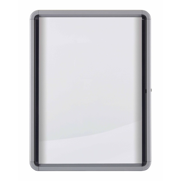 Ideata per un uso in interni, dispone di una cornice contemporanea in alluminio, di un fondo a lavagna bianca magnetica e di un’anta di vetro su cardini. Con dimensioni di 732 mm (A) e 572 mm (L), la bacheca è capace di accogliere fino a 4 poster di formato A4.