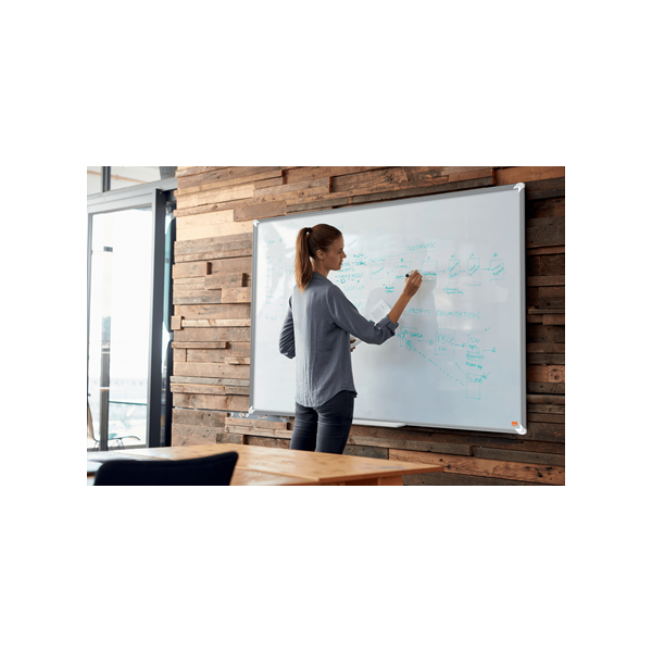 Lavagna bianca magnetica smaltata con una moderna ed elegante cornice in alluminio. Dotata di sistema di montaggio angolare e di un’ampia vaschetta porta accessori per depositare pennarelli e cancellini. La superficie della lavagna magnetica laccata offre un livello superiore di cancellabilità per un uso frequente.