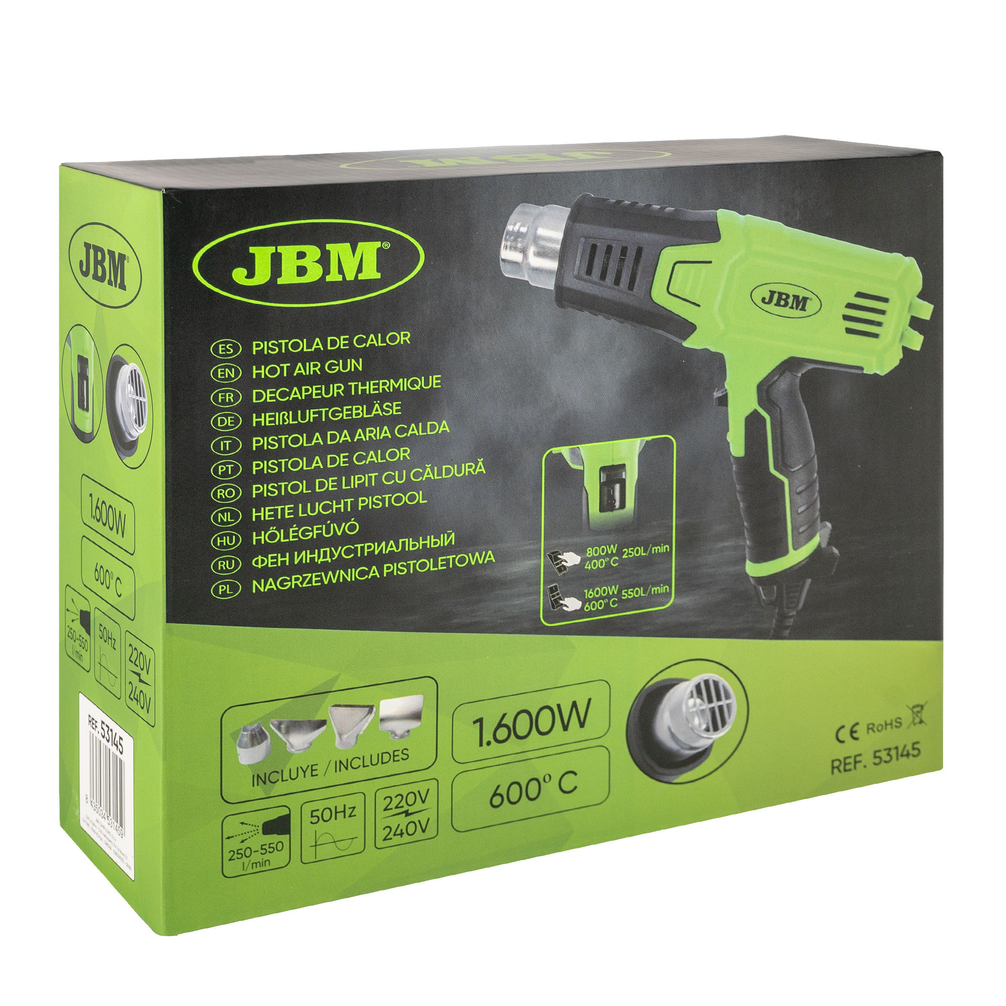 Pistola termica a batteria, con 2 modalità di calore. A seconda della temperatura selezionata, può essere utilizzata per diverse funzioni come: sciogliere o ammorbidire la vernice, piegare i tubi di plastica, riparare la carrozzeria dell’auto…Specifiche tecniche:· 220V-240V.· 50Hz-60Hz.· Temperatura di uscita: 50-600ºC.· Flusso d’aria: 250-550L / min.· 2 opzioni di temperatura: 400 e 600ºC.