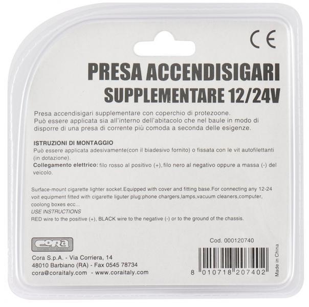 Presa di corrente supplementare 12/24V da collocare nell’abitacolo o nel baule. Collegamento elettrico mediante connettori rapidi in dotazione. Si applica con viti (fornite). Amperaggio max 10 A.