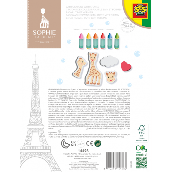 Questi gessetti sono molto speciali! Perché? Perché si possono portare nella vasca da bagno! Il tuo piccolo si divertirà sicuramente durante il bagno giocando con le figure in gommapiuma di Sophie e dei suoi amici. I gessetti possono essere utilizzati per creare bellissime opere d’arte sulle piastrelle del bagno. Le figure di gommapiuma possono anche essere attaccate al muro con un po’ d’acqua. Una volta finito di giocare, è sufficiente sciacquare le piastrelle con acqua.