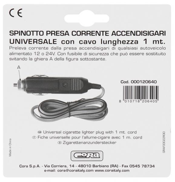 Spinotto universale per presa accendisigari 12 o 24V. Con cavo lungo 1 m. Output: 120W, 5A(MAX).