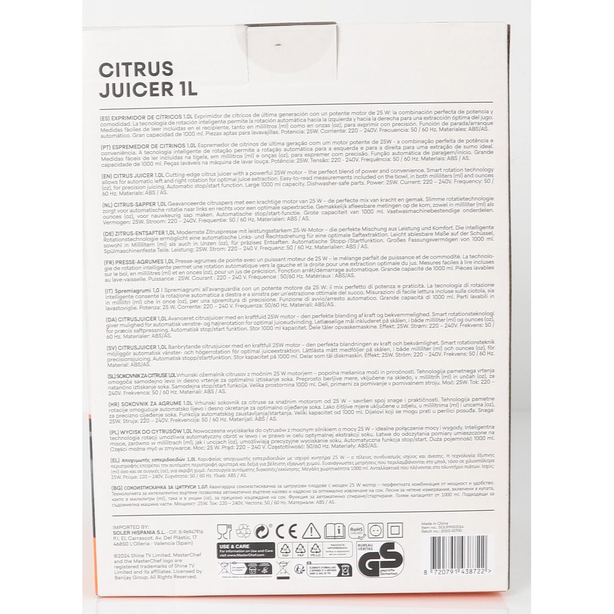 Lo spremiagrumi elettrico MasterChef è un dispositivo progettato per facilitare l’estrazione del succo di agrumi con efficienza e praticità in casa o in piccoli ambienti. Dotato di una potenza di 30 W, consente una spremitura rapida e uniforme, ideale per arance, limoni, lime e pompelmi. La sua capacità di 1 litro offre un volume sufficiente per preparare più porzioni di succo senza dover svuotare frequentemente il contenitore, aumentando la comodità durante l’uso. Questo spremiagrumi elettrico, di tipo classico per agrumi, integra un sistema di azionamento che si adatta alle dimensioni del frutto, garantendo un’estrazione ottimale del succo e riducendo lo sforzo manuale. La struttura compatta e funzionale è pensata per facilitare la pulizia e lo stoccaggio, risultando adatta sia per uso domestico sia per piccoli uffici o spazi dove si consuma succo fresco regolarmente. Il design di questo spremiagrumi MasterChef combina semplicità ed efficacia, rendendolo uno strumento essenziale per chi cerca una soluzione affidabile e pratica per estrarre succo naturale rapidamente e con facilità. In sintesi, rappresenta una soluzione standard, efficiente e maneggevole per l’estrazione quotidiana di agrumi.