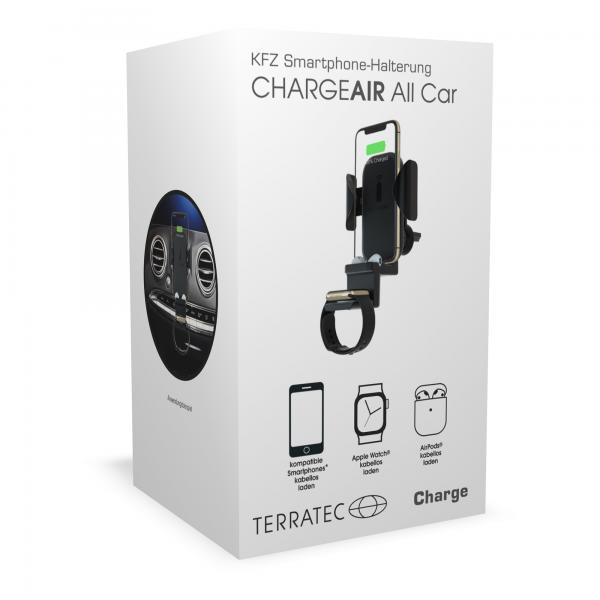 Il TERRATEC ChargeAir All Car li porta tutti con te: il supporto intelligente per auto non solo si prende cura di smartphone, Apple AirPods e Apple Watch durante la guida, ma carica anche i dispositivi mobili in modalità wireless durante il viaggio. Il caos nella consolle centrale o la batteria scarica dello smartphone durante la navigazione appartengono al passato grazie al supporto a induzione per le griglie di ventilazione, un adattatore di ricarica rapida per l’accendisigari e un cavo da USB a micro-USB da 100 cm sono inclusi nel caricabatterie.