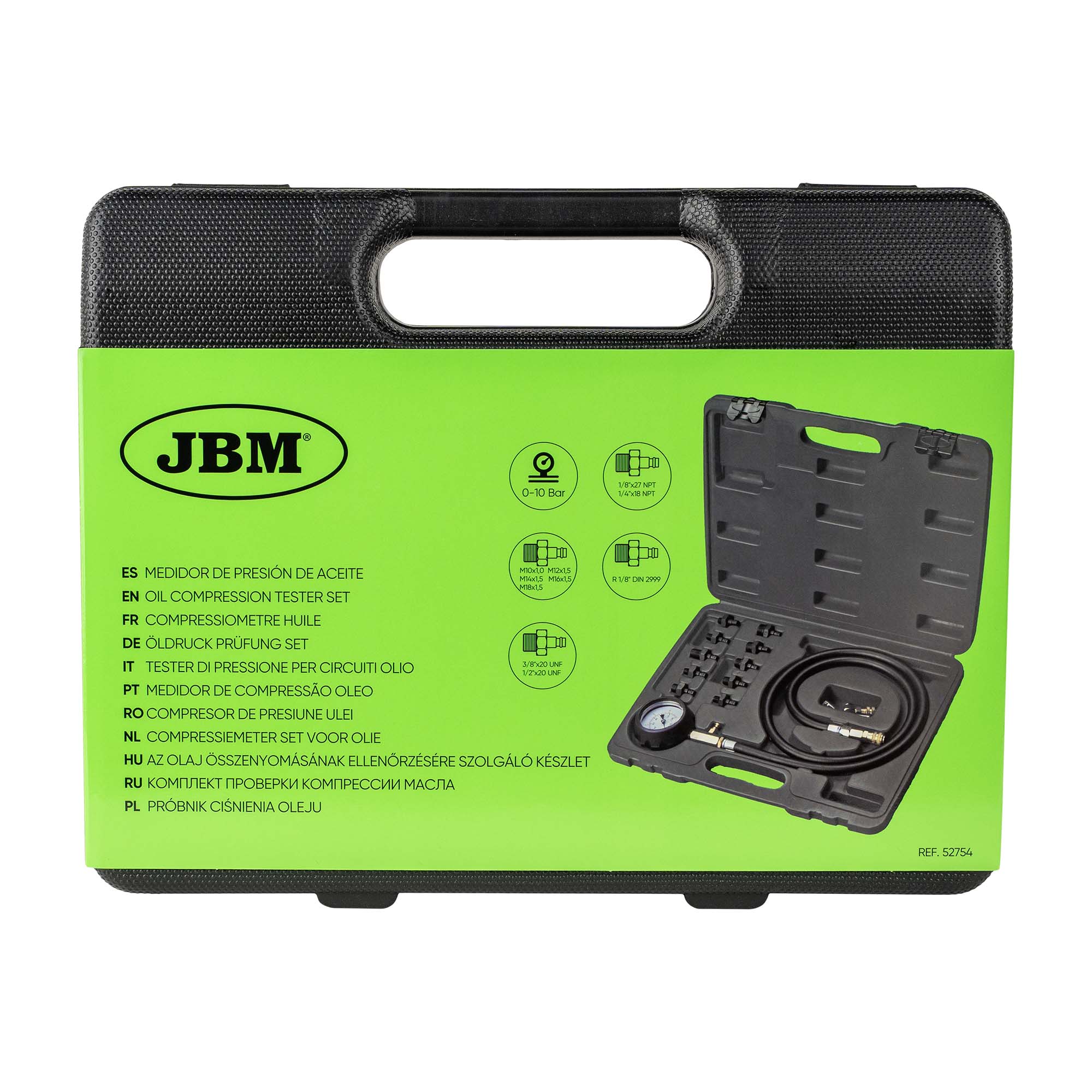 Range di misura: 0-10 barUtile per testare e diagnosticare problemi nei circuiti olio. Adattatori per la maggior parte dei veicoli disponibili sul mercato.M10x1.0mm M12x1.5mmM14x1.5mmM16x1.5mmM18x1.5mm