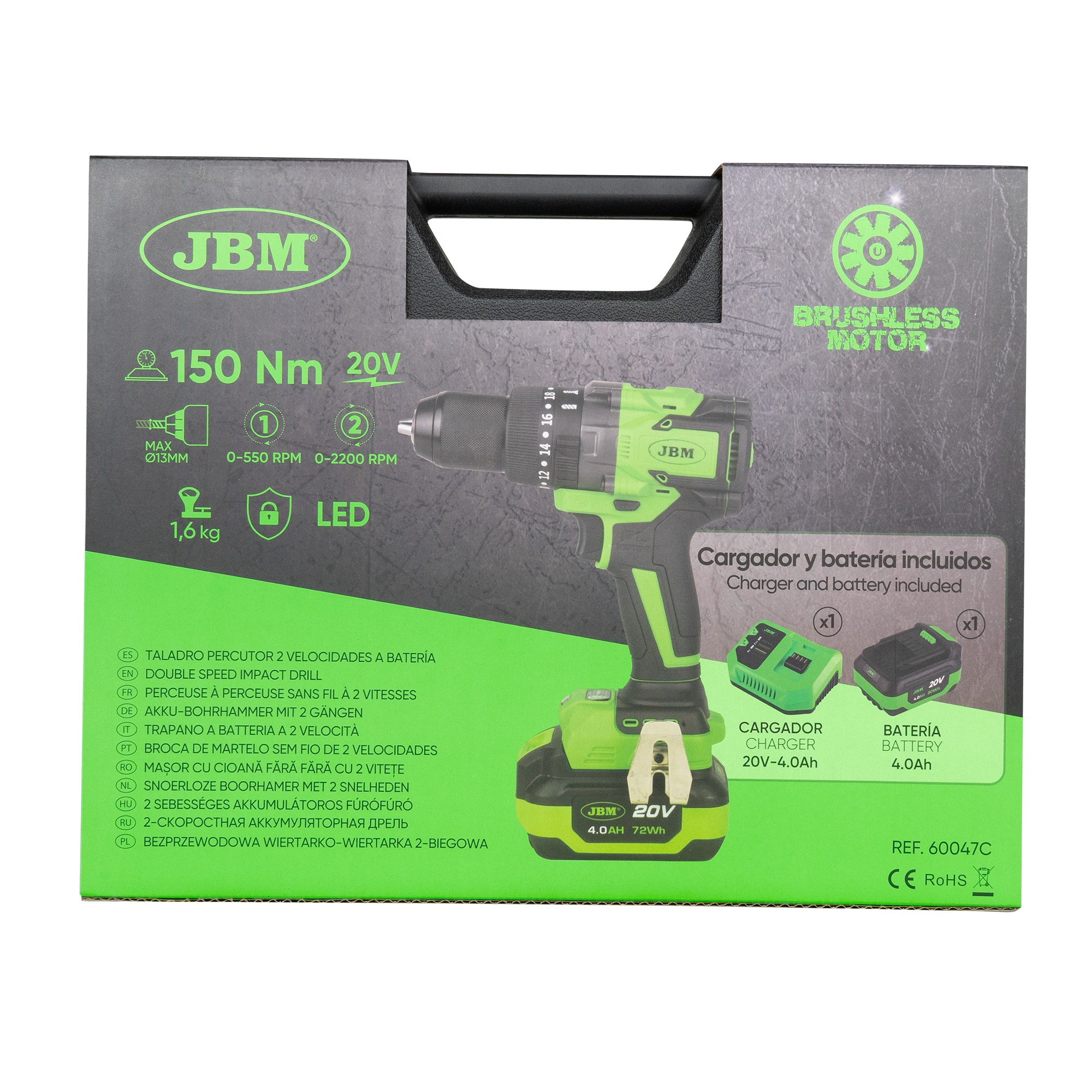 LA VALIGETTA CONTIENE:REF: 60047 – PERFORATORE A PERCUSSIONE.REF: 60013 – BATTERIA LI-ION 4.0AH.REF: 60016 – CARICABATTERIE 20V 4A.SPECIFICHE TECNICHE:· Nuova generazione con un design migliorato per perforare diversi tipi di materiali: legno, metallo…· Integra un anello di regolazione che consente di scegliere tra 20 livelli di coppia diversi, permettendoci di adattarci a diversi lavori: perforazione con percussione, serraggio o allentamento e svitamento di dadi o viti.· Dotato di selettore di velocità, rotazione e blocco per prevenire l’avvio accidentale.· Dotato di luce LED per ambienti con scarsa visibilità.· Accessori inclusi: gancio per agganciamento alla cintura e manico ausiliario per una presa migliore.QUESTO MODELLO NON È COMPATIBILE CON LE BATTERIE 2.0AH (REF: 60012).