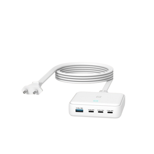 Alimentatore compatto da scrivania con quattro porte da 100W, di cui tre con uscita USB-C Power-Delivery e una con uscita USB-A Quick Charge 3.0. Dotato di tecnologia GaN, che lo rende compatto e potente, l’alimentatore universale da 100W può ricaricare simultaneamente anche 4 dispositivi offrendo una potenza in uscita complessiva da 100W, in grado di ricaricare un iPhone fino all’80% in 50 minuti, un iPad Pro in 52 minuti e un MacBook Pro 16″ in 90 minuti. L’alimentatore da scrivania può essere utilizzato solo tramite presa da parete. Il cavo di alimentazione, con spina europea, è lungo 1,5 mt.