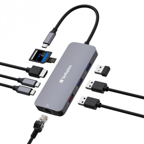 L’hub multiporta USB-C® Pro 9 porte di Verbatim offre nove porte versatili che includono generazioni differenti di USB-C e USB-A garantendo la massima compatibilità con i dispositivi. Immergiti nell’uscita video 4K grazie alla porta HDMI, sfrutta le velocità offerte da una connessione Internet via cavo con la porta gigabit ethernet e trasferisci foto e dati rapidamente e facilmente grazie agli slot per scheda di memoria SD e microSD. L’hub è caratterizzato da due porte USB-C e una porta USB-A a velocità fino a 10Gb/s e da due porte USB-A a velocità fino a 5Gb/s che garantiscono la massima connettività del dispositivo.