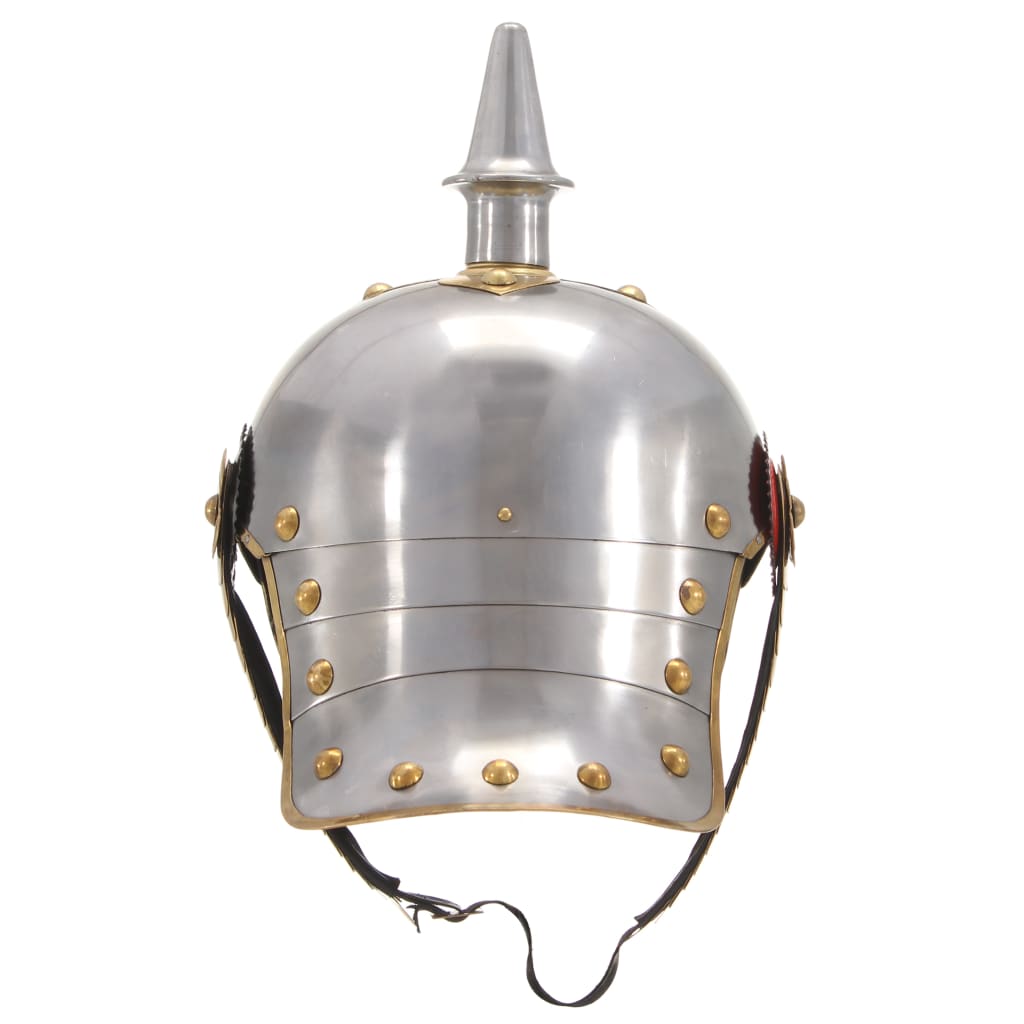 Dieser Rüstungshelm in Antik-Optik eignet sich hervorragend für LARP (Live-Action-Rollenspiel), Cosplay, Partys mit historischem Thema, Halloween-Party, Theaterrequisiten und historische Nachstellungen (Reenactments). Dieser Helm ist eine exakte Nachbildung eines original deutschen Soldatenhelms, und zwar der Kaiser Tschako Helm aus dem Großherzogtum Hessen. Es besteht aus poliertem Stahl der Stärke 18 mit Messingkanten und kombiniert Antik-Stil und robustes Material zu einem auffälligen Helm, der perfekt zu Ihrem Soldaten-Ausrüstung passt. Darüber hinaus ist er auch ein attraktives Ausstellungsstück und eine perfekte Wahl für Kostüme und Veranstaltungen. Der Helm ist auch mit einem Adler dekoriert, der seine Flügel hoch hält, und mit einem verstellbaren Kinnband versehen. Das Kinnband ist seitlich vernietet und mit Messing-Klee mit 3 Kreuzen verziert.